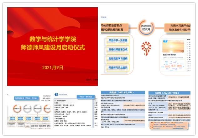 教师是立教之本、兴教之源,师德师风建设工作制度化、常态化是数学与统计学学院党委的一贯遵循,师德师风“四个建设机制-五项行动计划”也是学院“六个一”党建工作机制之“一支好教师队伍”的重要内容。第37个教师节来临之际,经学院党委研究,确定9月份为学院“师德师风建设月”,并于9月9日下午组织全体教师举行了“2021年师德师风建设月”线上启动仪式。