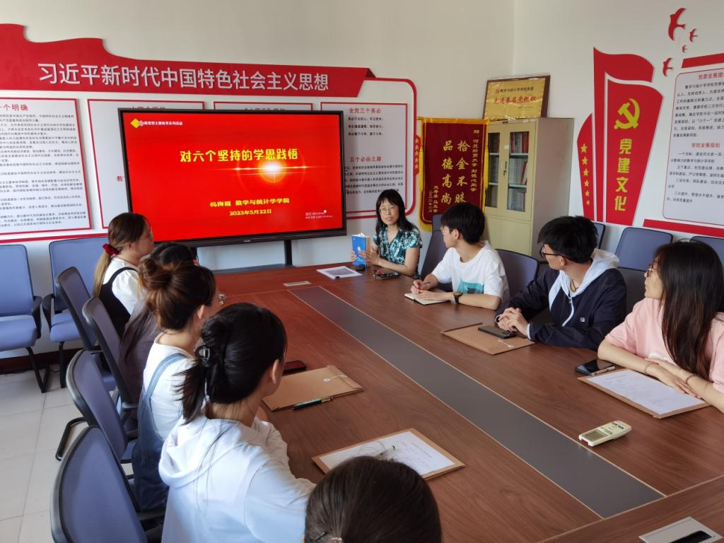 祃海霞以《对六个坚持的学思践悟》为题,在系统介绍“十个明确”“十四个坚持”“十三个方面成就”“两个结合”“六个必须坚持”的基础上,结合工作实际,以坚持人民至上、坚持问题导向、坚持系统观念为学习重点,利用详实的数据资料和生动形象的多媒体课件,带领大家回顾了学院“六个一”党建品牌的系统设计思路和主要内容;介绍了基于党务业务深度融合难题的党支部“一两句话、三五件事、七八成果”解题思路以及取得的党建引领路径图阶段成果;同时,结合三全育人、五育并举教育要求,从专业导师规定规范、专业地图及学生发展路径规划、专业导学简图设计等方面向同学们解读了“五位一体愿景引领”在专业育人中的具现思路和举措,鼓励同学们好好学习、积极实践,做善思考、会学习的“心灵手巧”有用人才。