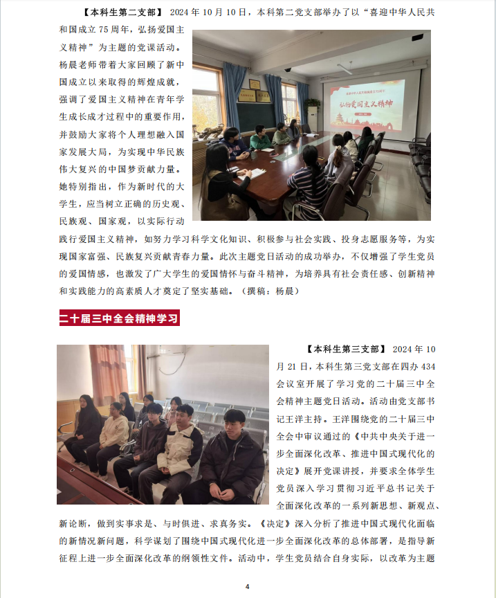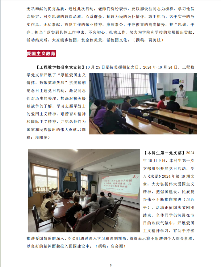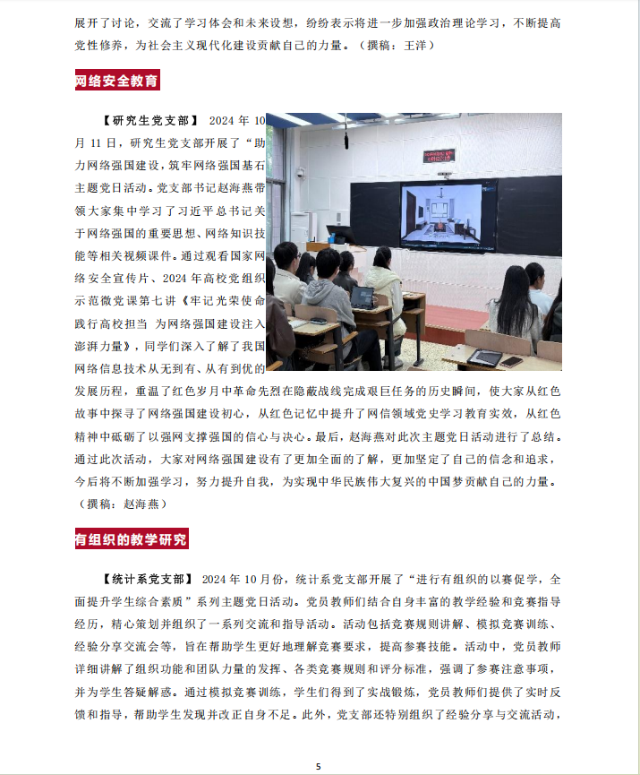 【行政党支部】2024年10月,行政党支部按照校党委和院党委的安排及要求,学习了习近平《论教育》等内容;10月11日集中观看了2024年高校党组织示范微党课(第二阶段)第七讲《牢记光荣使命 践行高校担当 为网络强国建设注入澎湃力量》,学习和实践活动取得了较好效果。(撰稿:张梅)