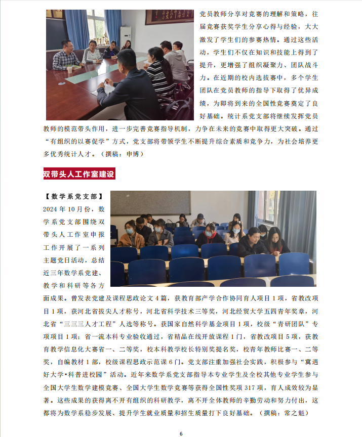 【数学系党支部】2024年10月份,数学系党支部围绕双带头人工作室申报工作开展了一系列主题党日活动,总结近三年数学系党建、教学和科研等各方面成果。曾发表党建及课程思政论文4篇,获教育部产学合作协同育人项目1项,省教改项目1项,获河北省拔尖人才称号,河北省科学技术三等奖,51吃瓜网