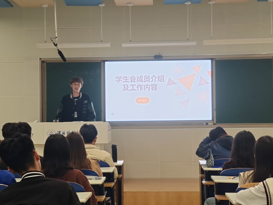 本次会议共分为四个部分。首先,学生会成员共同学习学生会的内部制度,对于遵守各项规章制度大家有了深刻认识,从而能够端正思想,摆正态度。其次,各部门部长及部员依次进行自我介绍,各位部长对近期工作进行总结,反思过程中的不足,明确今后努力的方向,并介绍本学期工作计划。接着,执行主席韩家昊,团委副书记张尚乐分别对学生会各方面指出不足、提出建议、传授心得,并激励学生会各位成员再创新辉煌。最后,王洋老师发表讲话,他指出要从三个方面加强学生会建设:明确定位,承担责任;发挥学生会的桥梁纽带作用;发挥学生会的核心骨干的作用。他希望学生会各部门各成员能够承担起责任,相互帮助、相互交流,充分发挥应有的作用。最后,王洋老师寄语学生会全体成员能够同心同德,共同努力,提高水平,创新境界。
