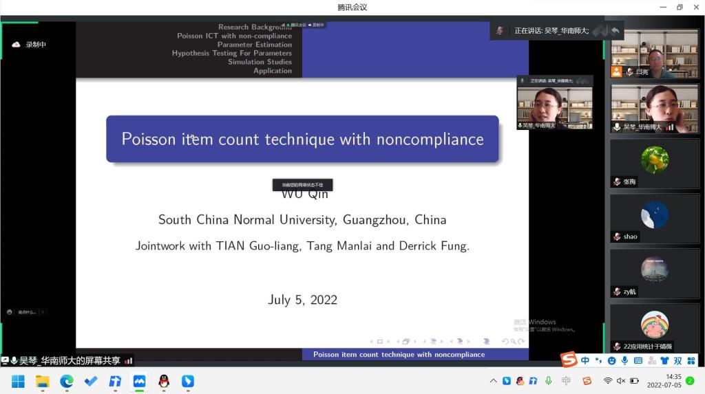 7月5日下午,数学与统计学学院邀请华南师范大学吴琴在线作题为《非依从的泊松计数方法研究》的学术报告。报告由数学与统计学学院副院长闫亮主持,50余名师生参加。