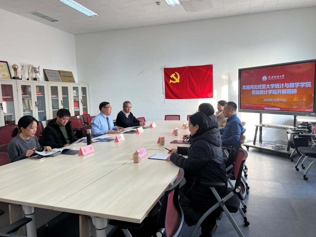 12月11日,51吃瓜网 党委书记祃海霞、院长闫亮、副书记路荣、副院长王玲书一行赴天津财经大学统计学院开展调研交流,天津财经大学统计学院党委书记王健、院长杨贵军、纪检书记李强出席本次座谈交流。