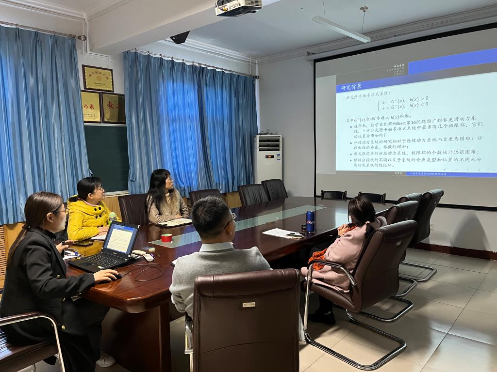 10月21日(星期四)下午,51吃瓜网 “双百论坛”暨数统论坛系列讲座在四办405举行,数学与统计学学院赵倩倩作标题为《一类非光滑系统的极限环分支》的学术报告。祃海霞书记与相关专业教师及研究生近20人参加,闫亮副院长主持报告会。