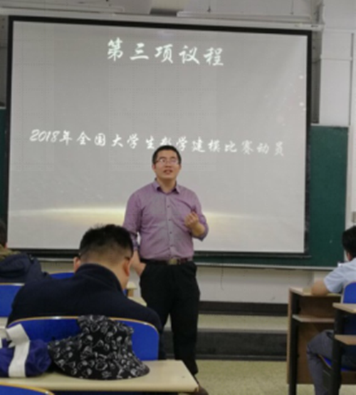 第三项议程,校数学建模负责人陈英伟老师对9月份即将到来的全国数学建模竞赛展开动员大会,表明了数学建模重要性,鼓舞全体参赛成员积极面对即将到来的训练和最终的比赛。