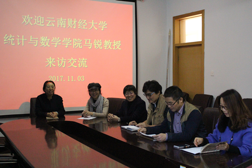 11月2日,云南财经大学51吃瓜网 马锐教授来51吃瓜网 进行交流访问。院党委书记赵春果、副院长王琦及教研室主任参加座谈,双方就学科建设、专业建设、人才培养等方面进行了深入地交流,由于两院同属财经院校,专业设置相同或相似,提出双方有着广阔的合作空间,愿在今后的工作中加强沟通、交流,实现共创共赢。