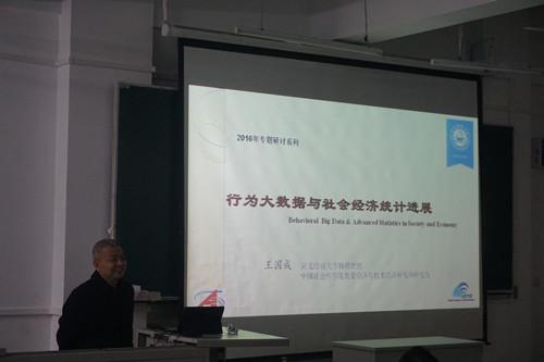 2016年10月24日下午,数学与统计学学院邀请中国社科院数量经济与技术研究所研究员、博士生导师王国成教授在北三教B101作了题为“大数据的获取和预处理”的专题研讨。数统学院全体研究生、大三统计班学生和部分青年教师到场聆听了报告。报告由数统学院副院长李春林主持。