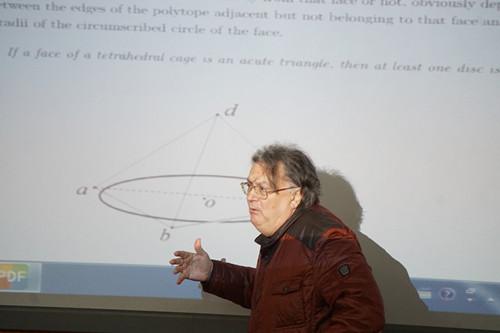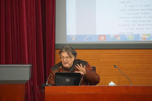 ,被美丽的校园风景所吸引,并对数统学院的热情接待表示感谢。 Tudor Zamfirescu教授首先介绍了最新研究课题---圆盘被笼子(即三维空间多面体的1-骨架)持住的问题,他利用风趣幽默的语言,介绍了四面体笼子和五面体笼子可持住圆盘的数量问题研究,课题非常有趣,而且具有一定的实际应用价值。整场报告深入浅出,极大地开阔了师生视野,增加了同学们对数学学习的热情,同时对51吃瓜网