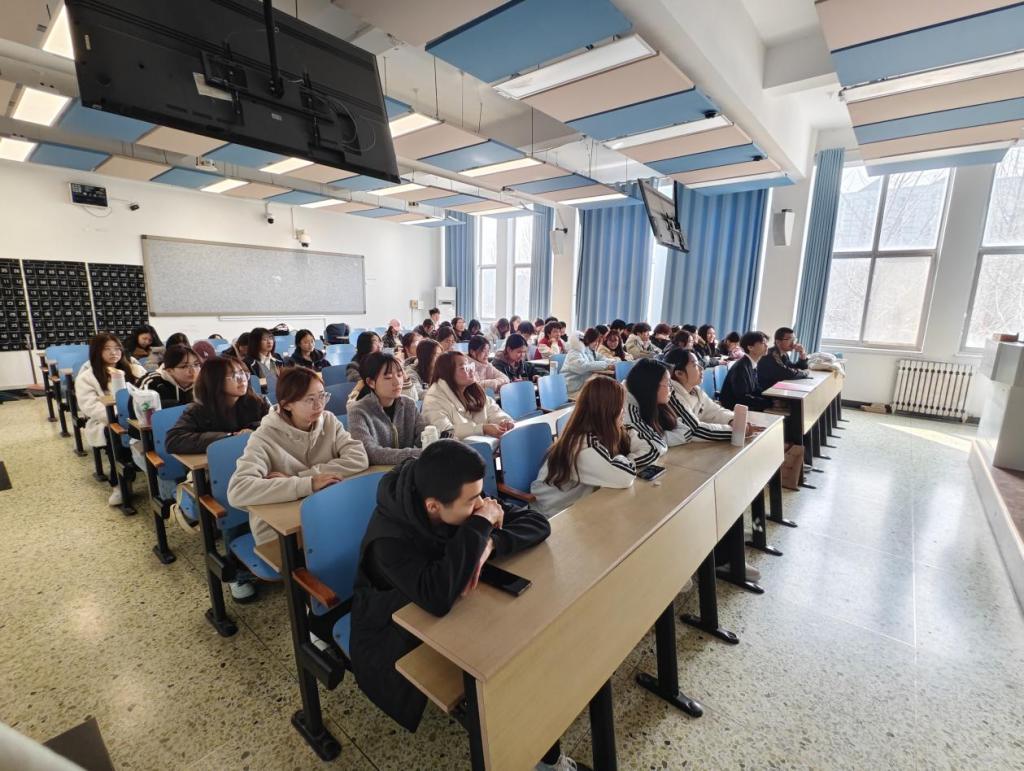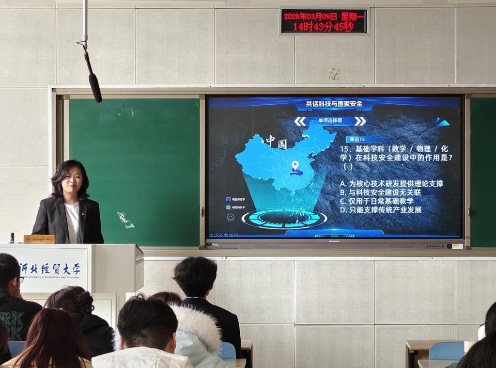 班长王翰林借助PPT,生动介绍“十五五”科技安全战略部署、关键核心技术攻关重点,以及当前面临的科技竞争、非传统安全等挑战,并用案例加深同学们理解。