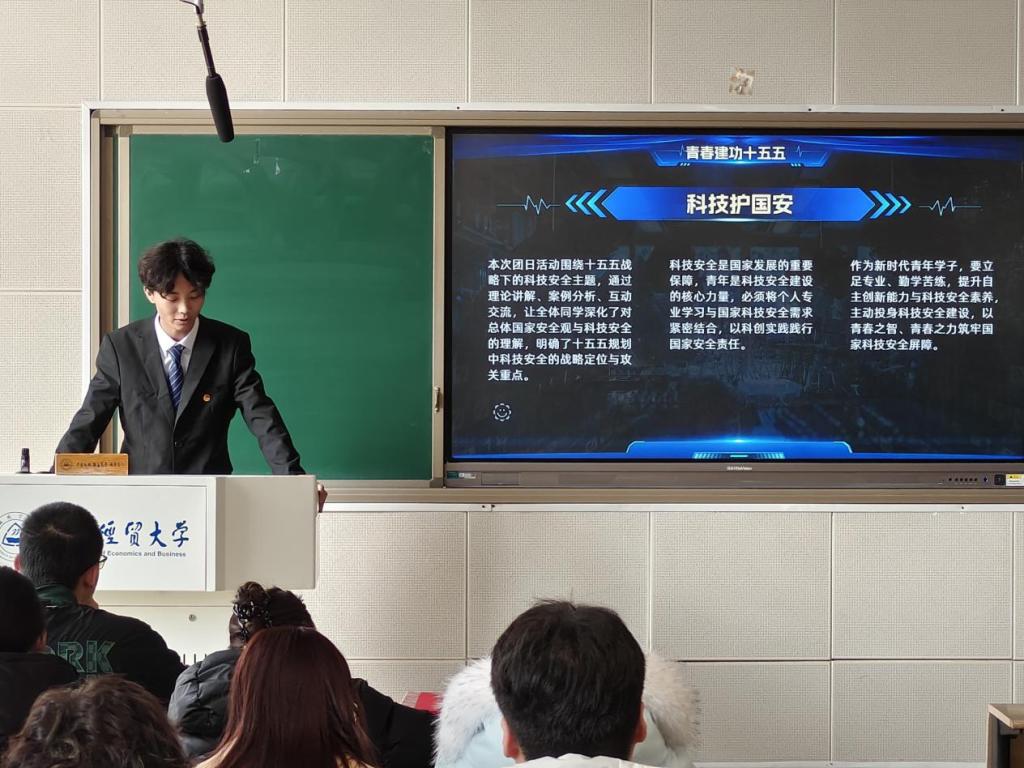 活动伊始,团支书沈芳竹以热情洋溢的开场白,清晰阐述了“十五五战略下的科技安全使命”这一团课主题,并播放科技安全科普视频。她结合科技安全是国家安全核心支柱、国家自立自强关键保障的重要意义,深入讲解活动背景与价值。