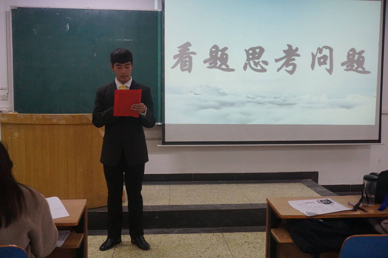 比赛进行第二环节设置情境问题思考,讨论五分钟后进入比赛,每组选出一个代表发表观点。经过激烈的讨论,两个小组结合情境综合考虑,展现了各自的优势,赢得了如潮好评。比赛结束,由评委和大众评审投上自己宝贵的一票。最终选手王洋折得桂冠,宋盈盈和牛朝阳荣获二等奖,袁旭羽和万云晴荣获三等奖。