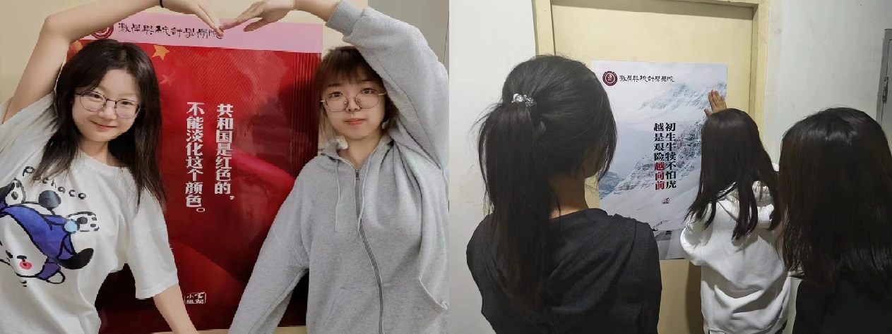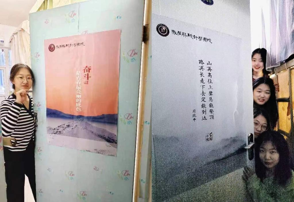 数学与统计学学院把一张张用心制作的海报贴进大学生宿舍。“共和国是红色的,不能淡化这个颜色”“青年时代,选择吃苦也就选择了收获,选择奉献也就选择了高尚”“要敢于做先锋,而不做过客,当看客”……这一举措让大学生思想政治教育工作更进一步贴近大学生生活,融入大学生日常。