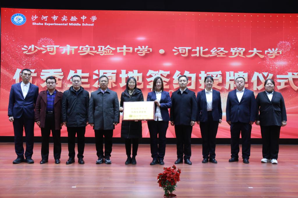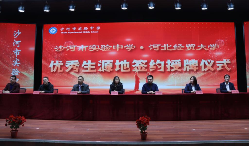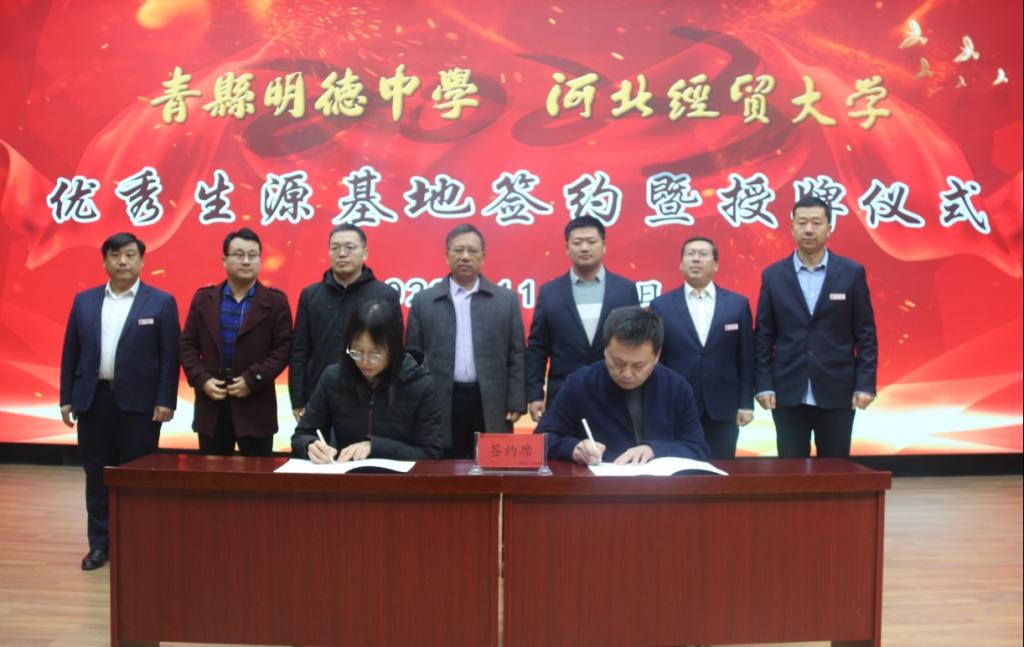 优秀生源基地”签约授牌仪式并开展招生宣讲活动,与廊坊树高高级中学开展生源基地签约授牌仪式。活动分别由青县明德高级中学执行校长王耀庭、沙河市实验中学副校长何超主持,中学领导班子、教师及全体学生参加活动。
