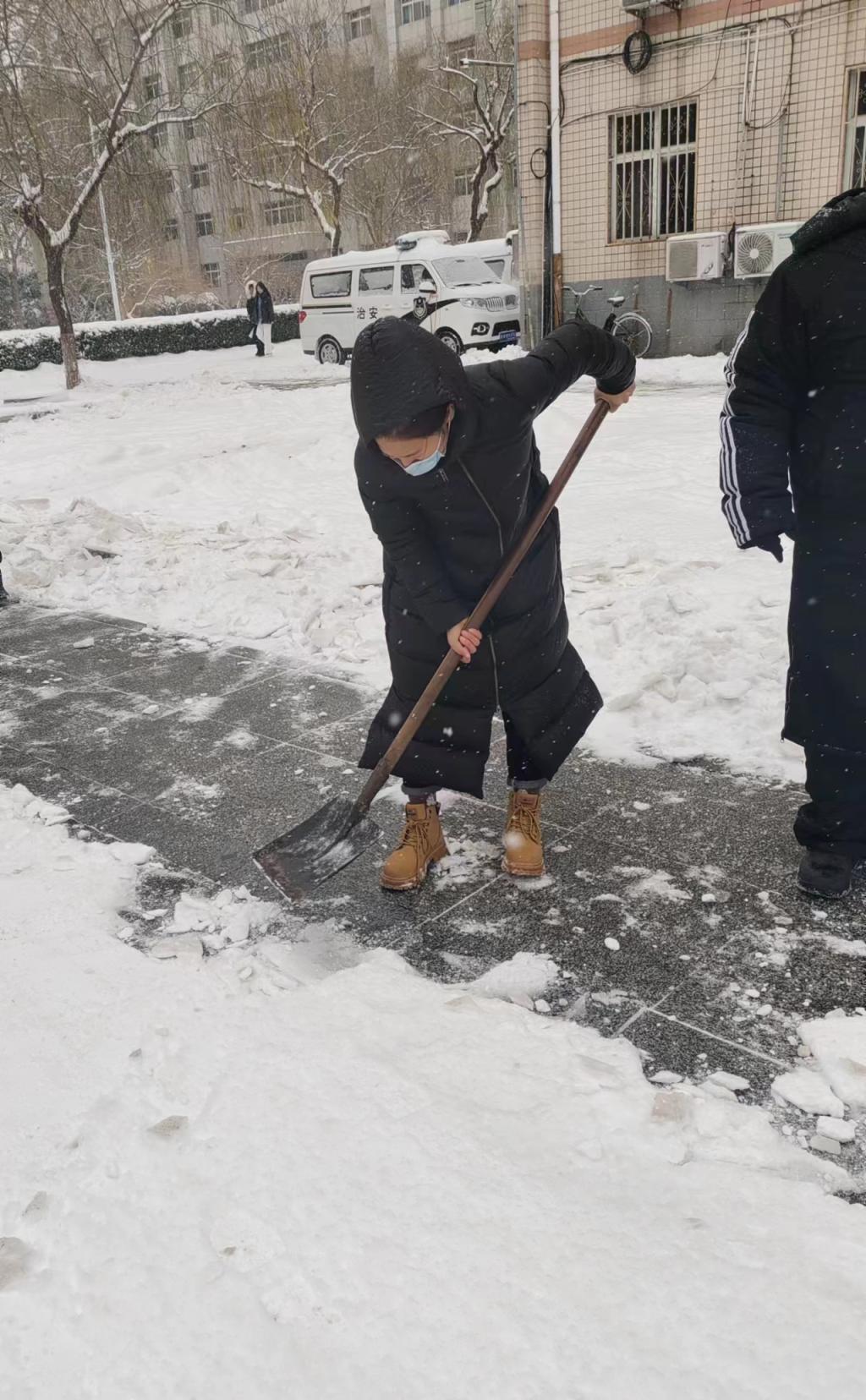 师生忙碌的身影,构成了一道靓丽的风景线,经过几小时的奋力清扫,积雪积冰情况得到缓解,一条条便于行走的道路重新出现在校园内,为师生的出行消除了安全隐患。