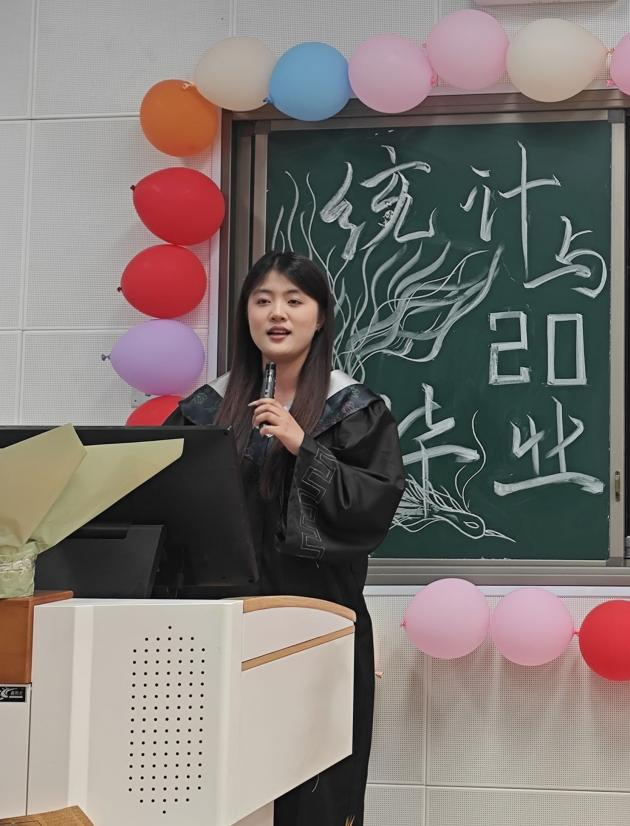 2020级应用统计学二班李紫诺和2022级应用统计专硕王玉洁同学作为毕业生代表发言。她们回顾了自己的大学生活和学习经历,分享了自己的成长和收获,向老师们表达了衷心的感谢和最崇高的敬意,并用自己与其他优秀毕业生的成功故事激励学弟学妹们要保持学习热情,不断提升自己,为社会做出积极贡献。