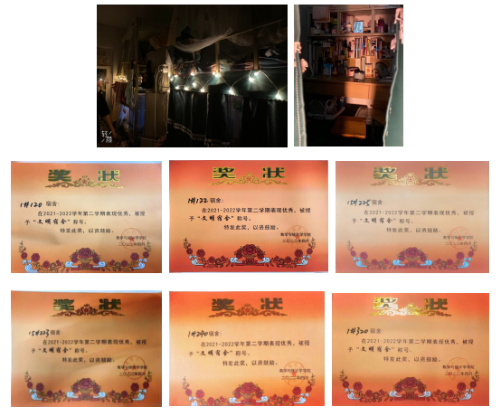 良好的生活环境同样重要,班级致力于培养良好舍风,舍友间关系融洽,宿舍文化独树一帜。班委轮流定期检查,2022年全班有6个宿舍获得学院“文明宿舍”称号。