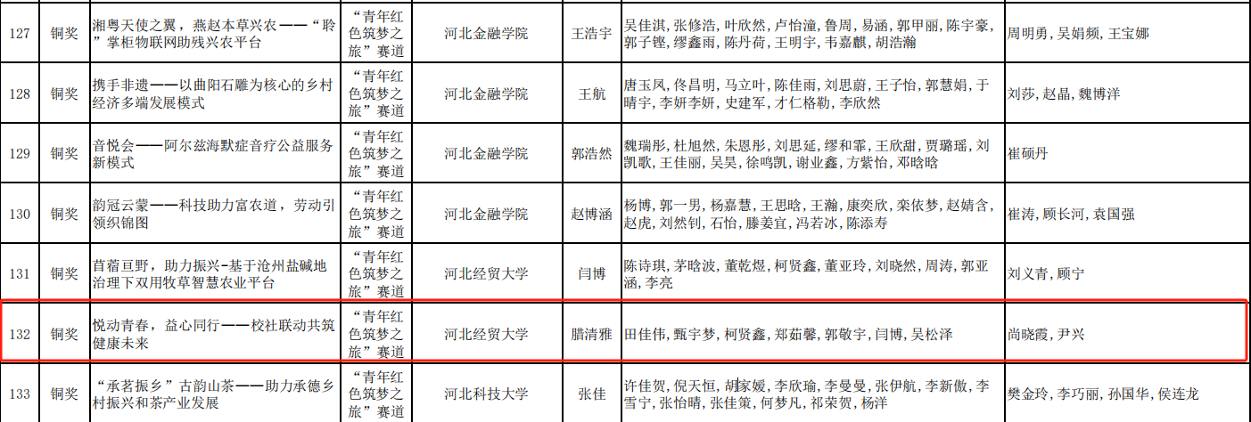 黄煊禾、胡忆雯、王婧淇、贾依凡、田佳伟、朱珈慧等同学的参赛作品《虾韵清波--智控生态系统的流动式对虾养殖水质净化装置领航者》在高教主赛道中荣获金奖;腊清雅、田佳伟等同学的参赛作品《悦动青春,益心同行——校社联动共筑健康未来》在“青年红色筑梦之旅”赛道中荣获铜奖。