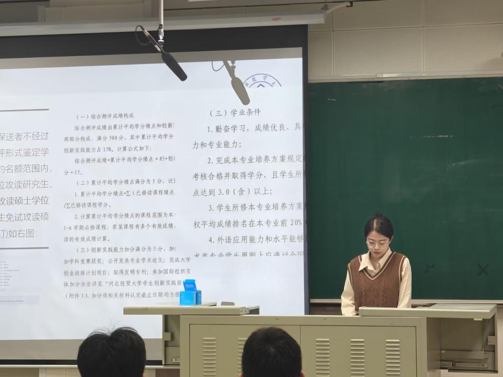 会议最后,路荣就大学生考研及就业做总结讲话。她向同学们分享了就业招聘网站,同时强调大三是大学生涯中的分水岭,鼓励同学们尽早规划,科学施策,制定合理目标,久久为功,期待与会同学毕业时都有一个理想的归宿。