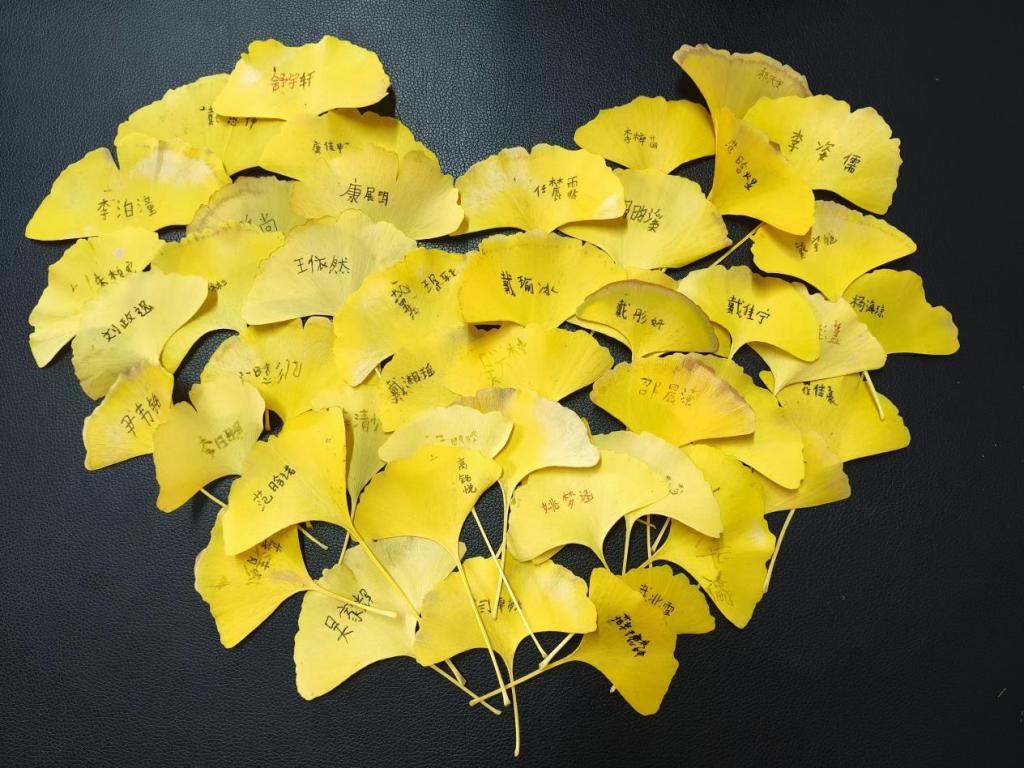 随后,志愿者们又将从经贸校园带来的特殊礼物—银杏叶分发给了孩子们,让他们在叶子上写下自己的名字。志愿者们又将叶子汇聚在一起,摆成爱心形状。一片银杏叶,一份教育情,志愿者们将知识带进大孙村小学,传递着爱与真情。