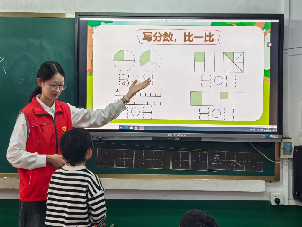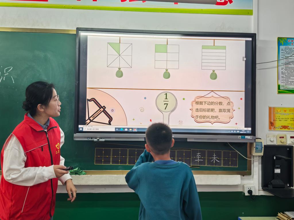活动现场,丛煜、李志彤、王烁三位志愿者同学为三年级一班的孩子们带来了一堂别开生面的数学课。课堂中,志愿者采用数学家的故事、互动游戏等方式引入数学知识,如吃桃子、分月饼、切巧克力、射击游戏,让学生们在轻松愉快的氛围中学习数学。志愿者鼓励孩子们积极回答问题,引导大家思考问题。