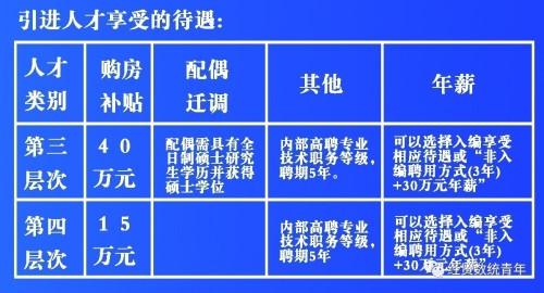 符合第三、第四层次条件的人才也可以选择“非入编聘用方式(人事、工资关系不转入学校)+年薪制”。