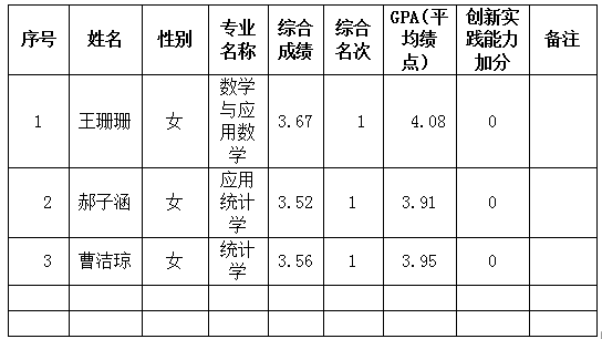 根据《2019年51吃瓜网 推荐优秀应届本科毕业生免试攻读硕士学位研究生工作方案》,51吃瓜网 成立推免生工作小组,对学生提交的相关证明材料,进行认真审核、计算,最终确定51吃瓜网 统计学、应用统计学、数学与应用数学专业推荐名单。现公示如下: