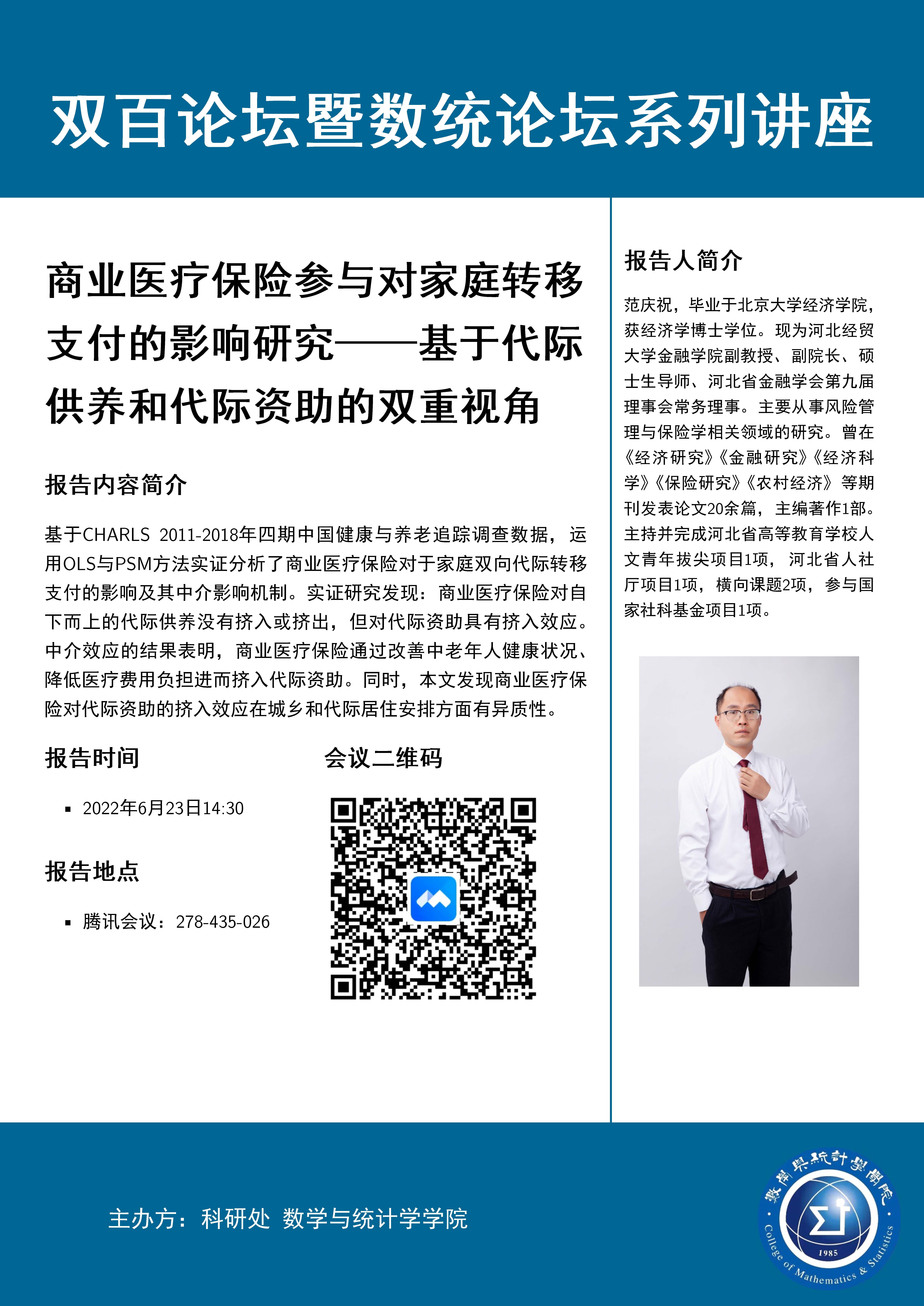 报告题目:商业医疗保险参与对家庭转移支付的影响研究——基于代际供养和代际资助的双重视角