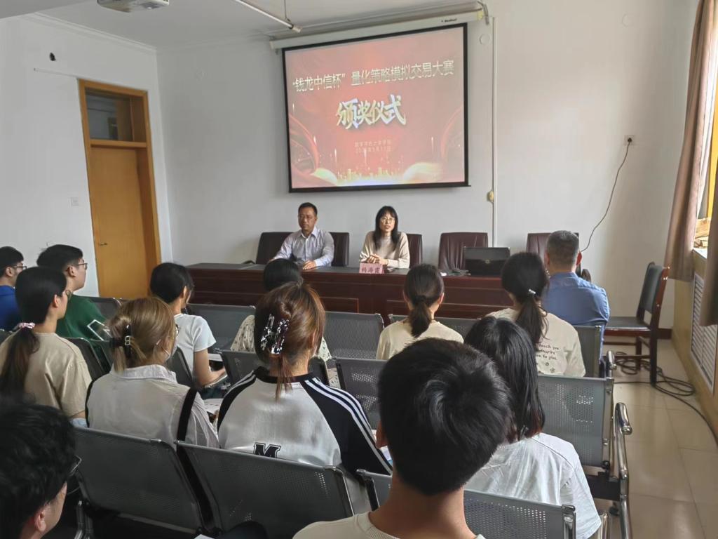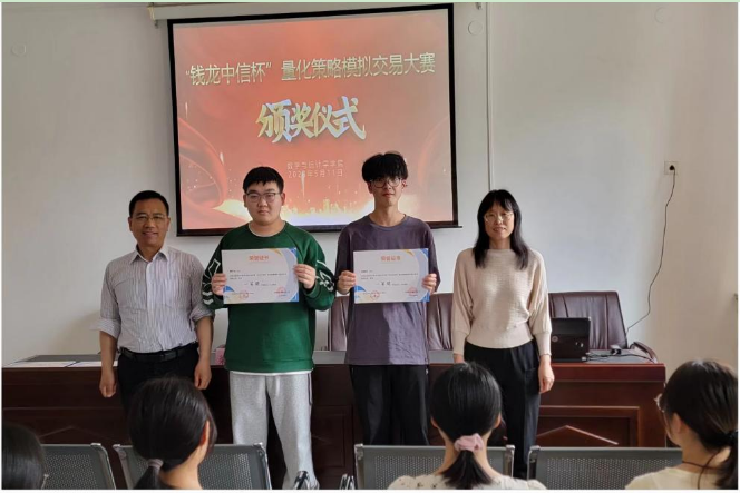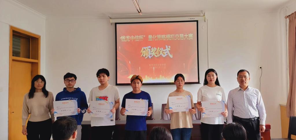 5月11日下午,数学与统计学学院在第四办公楼434会议室举行了“钱龙中信杯”量化策略模拟交易大赛颁奖典礼。典礼由李蒙老师主持,院党委书记祃海霞、院长梁建英、院党委委员耿会清出席,获奖的17名同学参加。