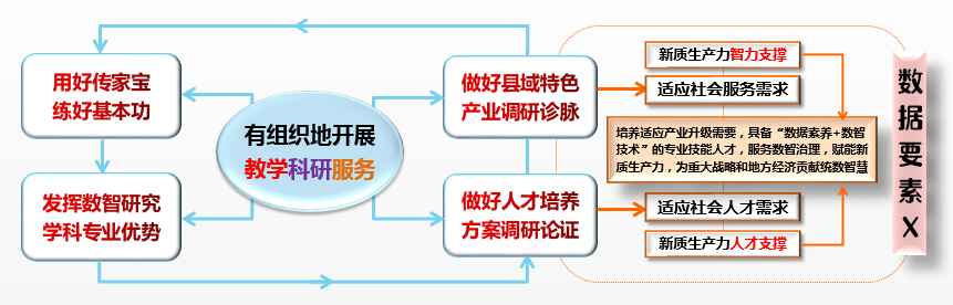 活动中,祃海霞基于高校五大基本职能和现代科技变革背景,强调要有组织地开展教学科研服务,用好传家宝练好基本功,发挥数智研究学科专业优势,做好规矩、规范、规划“三规”文章,全院上下统筹做好人才培养方案论证调研、县域特色产业诊脉调研,思变谋变,进一步适应社会人才需求和社会服务需求,培养更多适应产业升级需要、具备“数据素养+数智技术”的专业技能人才,提供新质生产力人才支撑和智力支撑,服务数智治理,为重大战略和地方经济贡献统数智慧。