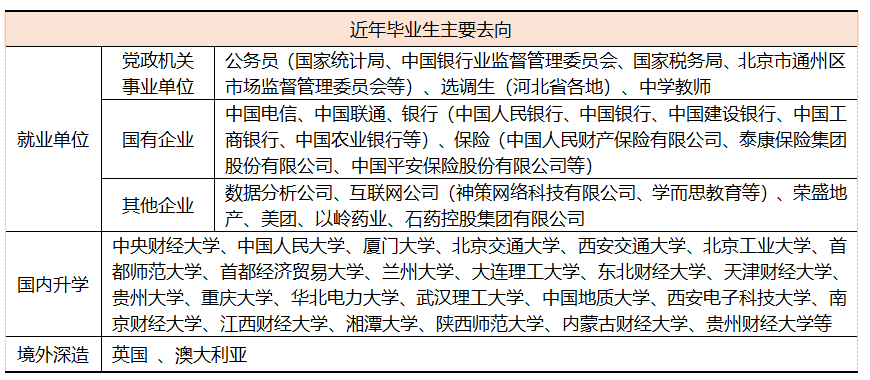 就业去向:(1)考取研究生(28%)、公务员、选调生等;(2)在银行、证券、保险等金融机构从事数据分析和投资管理工作;(3)在政府部门、企事业单位从事统计调查、统计信息管理、数据分析等工作。