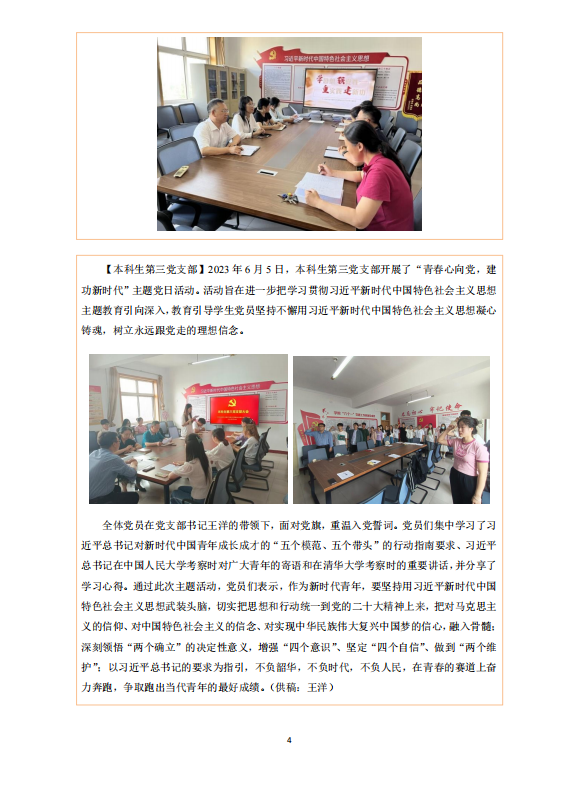 【本科生第三党支部】2023年6月5日,本科生第三党支部开展了“青春心向党,建功新时代”主题党日活动。活动旨在进一步把学习贯彻习近平新时代中国特色社会主义思想主题教育引向深入,教育引导学生党员坚持不懈用习近平新时代中国特色社会主义思想凝心铸魂,树立永远跟党走的理想信念。