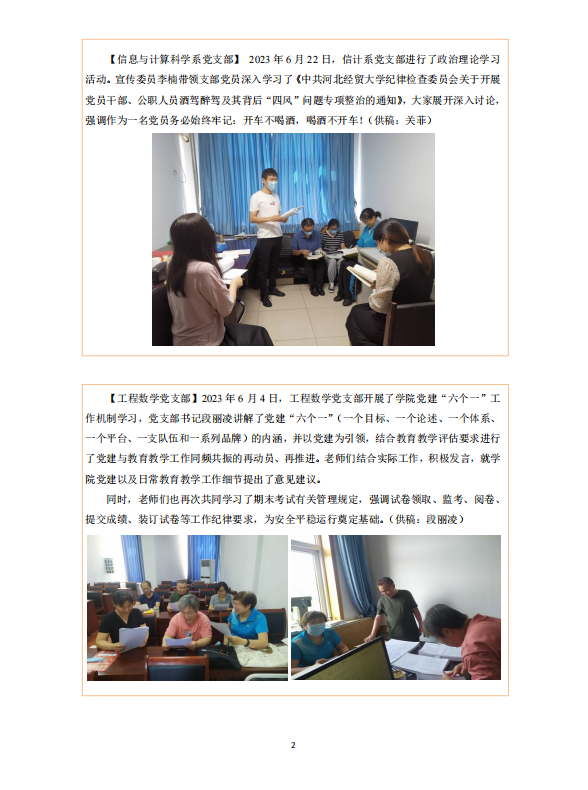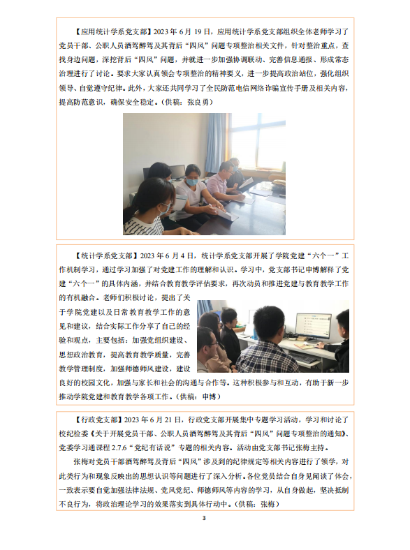 【应用统计学系党支部】2023年6月19日,应用统计学系党支部组织全体老师学习了党员干部、公职人员酒驾醉驾及其背后“四风”问题专项整治相关文件,针对整治重点,查找身边问题,深挖背后“四风”问题,并就进一步加强协调联动、完善信息通报、形成常态治理进行了讨论。要求大家认真领会专项整治的精神要义,进一步提高政治站位,强化组织领导、自觉遵守纪律。此外,大家还共同学习了全民防范电信网络诈骗宣传手册及相关内容,提高防范意识,确保安全稳定。(供稿:张良勇)