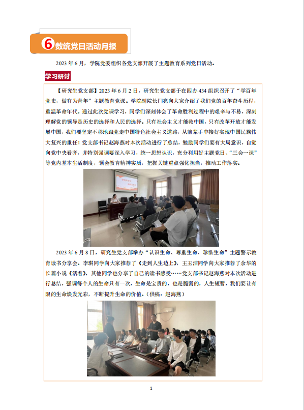 2023年6月8日,研究生党支部举办“认识生命、尊重生命、珍惜生命”主题警示教育读书分享会。李琪同学向大家推荐了《走到人生边上》,王玉洁同学向大家推荐了余华的长篇小说《活着》,其他同学也分享了自己的读书感受……党支部书记赵海燕对本次活动进行总结,强调每个人的生命只有一次,生命是宝贵的,也是脆弱的,人生短暂,我们要让有限的生命焕发光彩,不断提升生命的价值。(供稿:赵海燕)