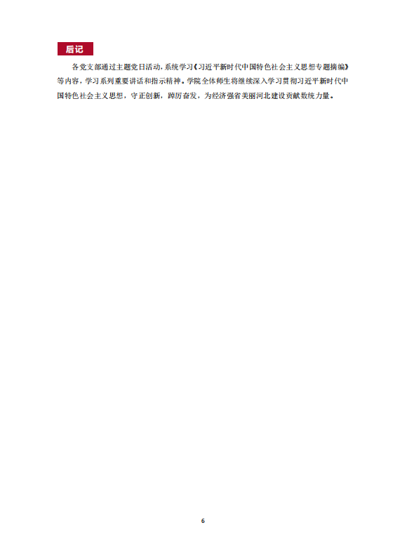各党支部通过主题党日活动,系统学习《习近平新时代中国特色社会主义思想专题摘编》等内容,学习系列重要讲话和指示精神。学院全体师生将继续深入学习贯彻习近平新时代中国特色社会主义思想,守正创新,踔厉奋发,为经济强省美丽河北建设贡献数统力量。