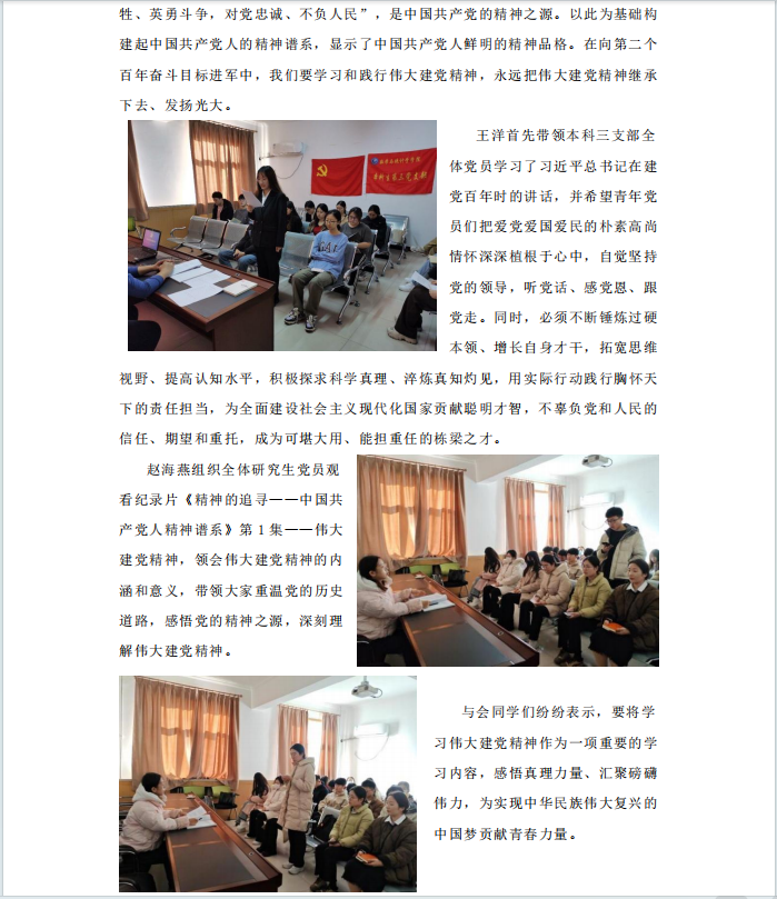 赵海燕组织全体研究生党员观看纪录片《精神的追寻——中国共产党人精神谱系》第1集——伟大建党精神,领会伟大建党精神的内涵和意义,带领大家重温党的历史道路,感悟党的精神之源,深刻理解伟大建党精神。