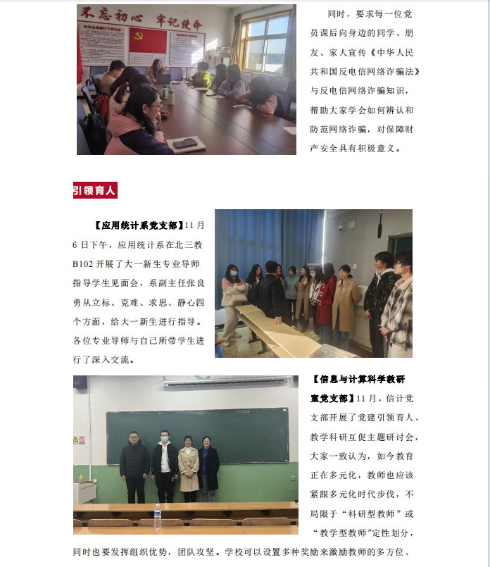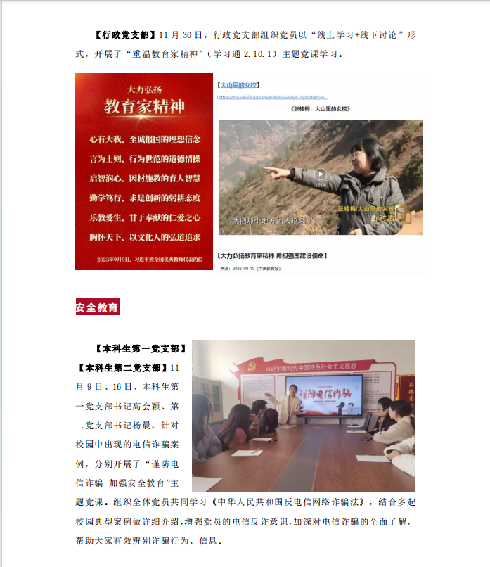 【本科生第一党支部】【本科生第二党支部】11月9日、16日,本科生第一党支部书记高会颖、第二党支部书记杨晨,针对校园中出现的电信诈骗案例,分别开展了“谨防电信诈骗 加强安全教育”主题党课。组织全体党员共同学习《中华人民共和国反电信网络诈骗法》,结合多起校园典型案例做详细介绍,增强党员的电信反诈意识,加深对电信诈骗的全面了解,帮助大家有效辨别诈骗行为、信息。