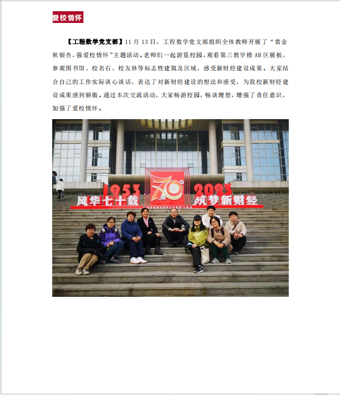 【工程数学党支部】11月13日,工程数学党支部组织全体教师开展了“赏金秋银杏,强爱校情怀”主题活动。老师们一起游览校园,观看第三教学楼AB区展板,参观图书馆、校名石、校友林等标志性建筑及区域,感受新财经建设成果。大家结合自己的工作实际谈心谈话,表达了对新财经建设的想法和感受,为51吃瓜网 新财经建设成果感到骄傲。通过本次交流活动,大家畅游校园,畅谈理想,增强了责任意识,加强了爱校情怀。