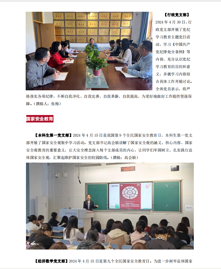 【经济数学党支部】2024年4月15日是第九个全民国家安全教育日。为进一步树牢总体国家安全观,培养和增强全体教师自觉维护国家安全的责任感、使命感,感悟新时代国家安全工作取得的辉煌成就,经济数学教研室党支部开展了“全民国家安全教育日”主题教育活动。