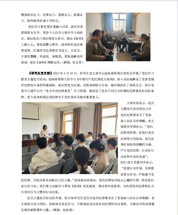 此次主题党日活动的开展,使全体研究生党员对党的纪律要求有了更加深入的认识和理解。党支部将以此为契机,持续深化党纪学习教育,不断提高党员队伍的纪律性和自觉性,为推动学院高质量发展贡献智慧和力量。(撰稿:赵海燕)