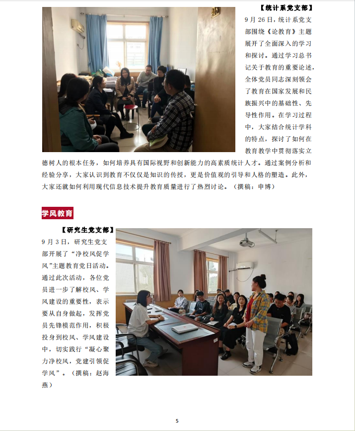 【统计系党支部】9月26日,统计系党支部围绕《论教育》主题展开了全面深入的学习和探讨。通过学习习近平总书记关于教育的重要论述,全体党员同志深刻领会了教育在国家发展和民族振兴中的基础性、先导性作用。在学习过程中,大家结合统计学科的特点,探讨了如何在教育教学中贯彻落实立德树人的根本任务,如何培养具有国际视野和创新能力的高素质统计人才。通过案例分析和经验分享,大家认识到教育不仅仅是知识的传授,更是价值观的引导和人格的塑造。此外,大家还就如何利用现代信息技术提升教育质量进行了热烈讨论。(撰稿:申博)