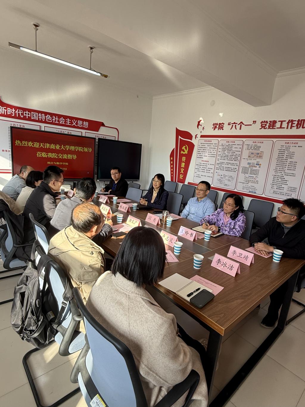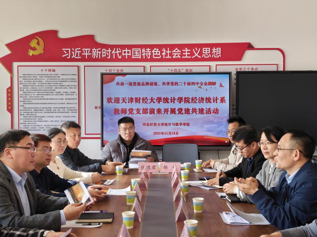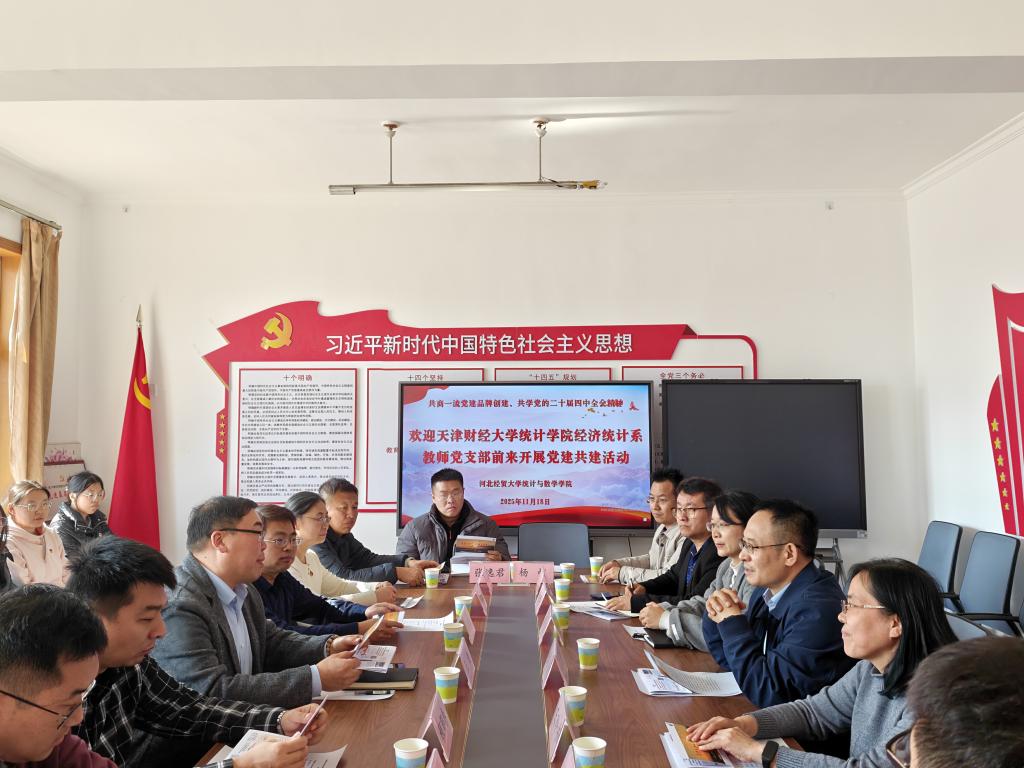 11月18日,天津财经大学统计学院党委书记王健、副院长程郁泰,经济统计系教师党支部书记段志民等10名教师及学生12人一行到访。学院院长闫亮、党委副书记路荣、副院长王玲书、张良勇、河北省“双带头人”党支部书记常之魁、专职组织员杨晨、团委书记王洋及学生10人热情接待,双方以“共商一流党建品牌创建、共学党的二十届四中全会精神”为主题开展了党建共建活动。