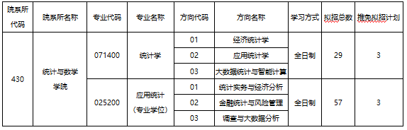 2026年全日制研究生拟招生86人,其中,统计学学术硕士29人,应用统计专业硕士57人(拟招人数含拟接收推荐免试生人数,最终招生计划以国家下达的指标为准。)
